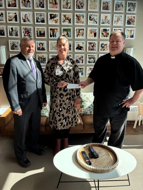 Council chaplain Fr. Gerard Cooper and Grand Knight Wayne Koshman, from Denis Mahoney Council #8125, presented a cheque on behalf of the Sask K of C Charitable Foundation, representing the donation earned from the sale of the Cash Calendars, to Lori Bjorkman, Director of Glengarda Hospice, Saskatoon, SK.