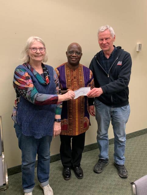 Gerry Rogal, Treasurer of Father Provost Council 5238 in Rosetown, presented a cheque on behalf of the Sask K of C Charitable Foundation, representing the donation earned from the sale of the Cash Calendars, to Wendy Clayton, Chair of the Rosetown Parish Council and Fr Habila Musa.